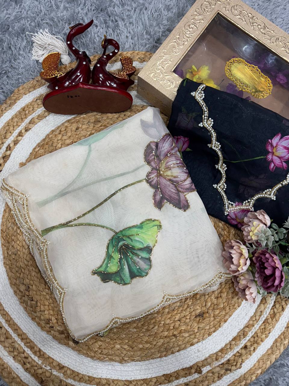 Soft Organza Saree with floral print, beads, and katdana handwork. Includes matching printed blouse. Priced at β‚Ή5,399.00.